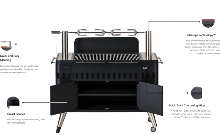 The built-in Rotiscope Technology lets you cook up to 85 lbs of meat with three adjustable height settings, while Cliplock Forks keep everything securely in place. Removable chrome grates with cool-touch handles make charcoal reloading easy, and the porcelain enamel firebox ensures effortless cleanup.